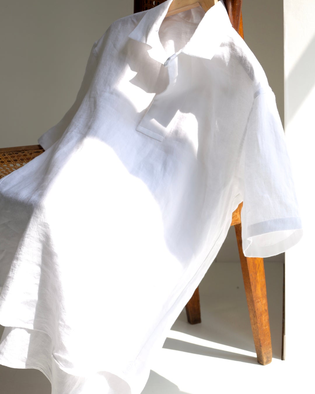 リネン素材の半袖シャツをホワイトとブルーの2色で展開いたします。