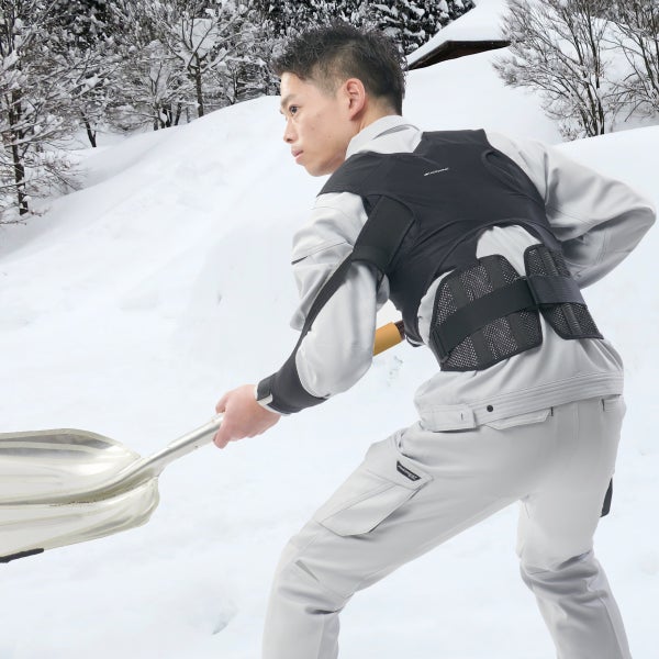 まるで衣服のような着用感の薄型アシストスーツです。本体の重量は約560g※と軽量でありながら、力強いアシストで腰や背部の負担を軽減します。ワンタッチでアシストのON/OFFが可能なため、着脱の手間がなく、装着したまま複合的な動きが可能です。