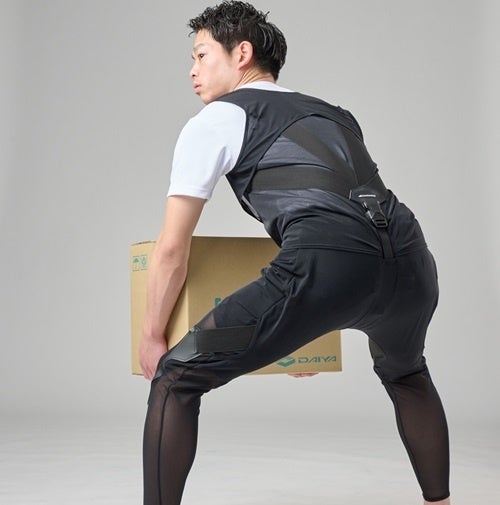 軽量性と柔軟性を兼ね備えたアシストスーツです(本体の重量:約450g※)。背部から大腿部にかけて高反発のゴムを配置し、ゴムの張力で持ち上げ動作に必要な腰や背部の負担を軽減します。また、身体への接触面が少なく、長時間の使用でも蒸れにくい設計になっています。
