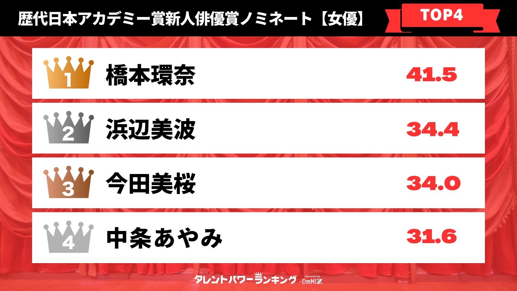 『タレントパワーランキング』では、タレントパワーランキングに登録されている、歴代の日本アカデミー賞新人俳優賞ノミネート俳優のパワースコアを調査。