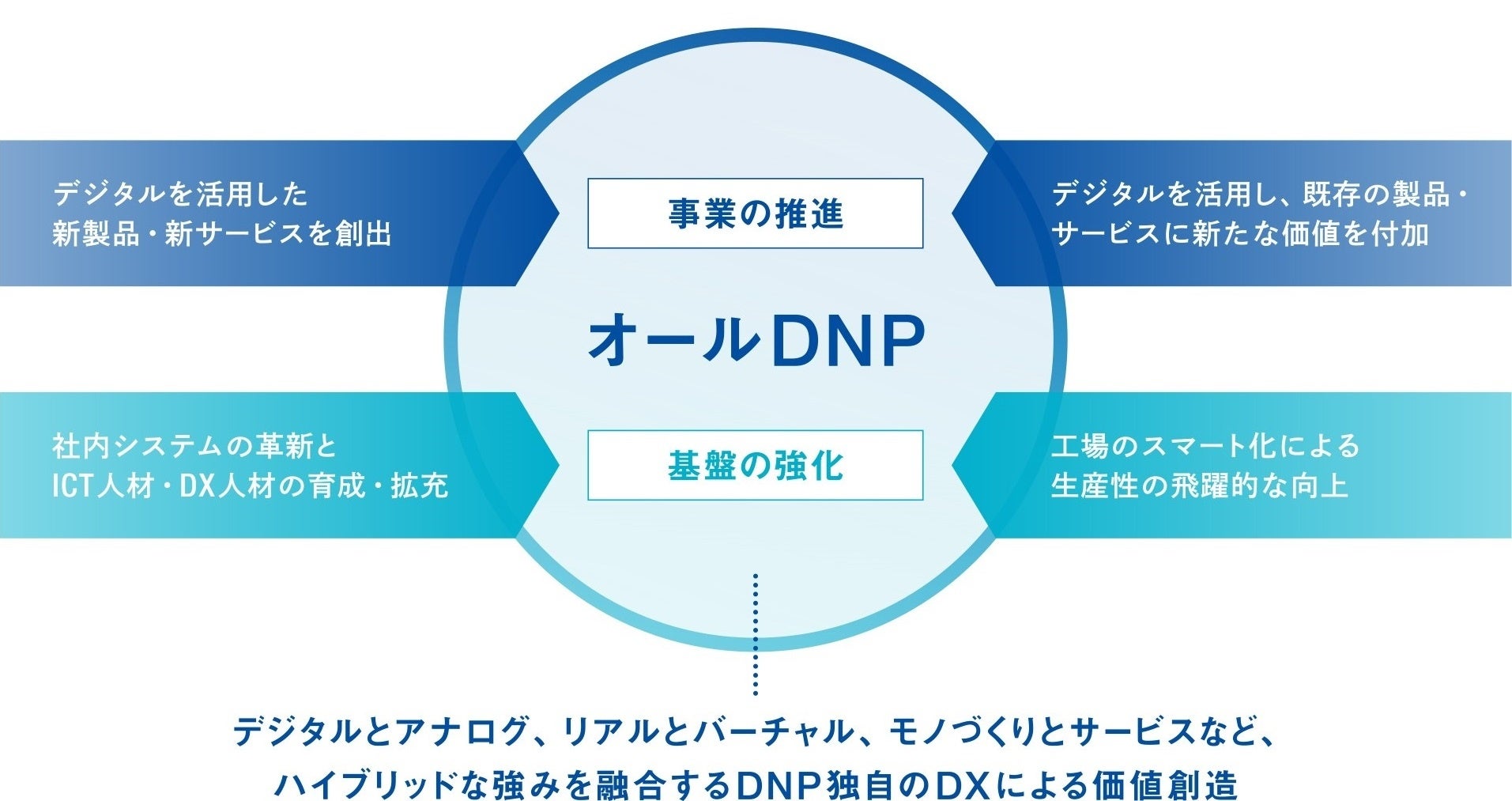 DNPはDXについて、事業ビジョンに掲げる「P&Iイノベーション」に基づき、独自の印刷(Printing)と情報(Information)の強みを掛け合わせて新しい価値を創造することであると位置づけています。デジタルとアナログ、リアルとバーチャル、モノづくりとサービス等のハイブリッドな強みを融合し、「人・モノ・体験」が連動するDNPならではの新しいビジネスモデルを生み出しています。