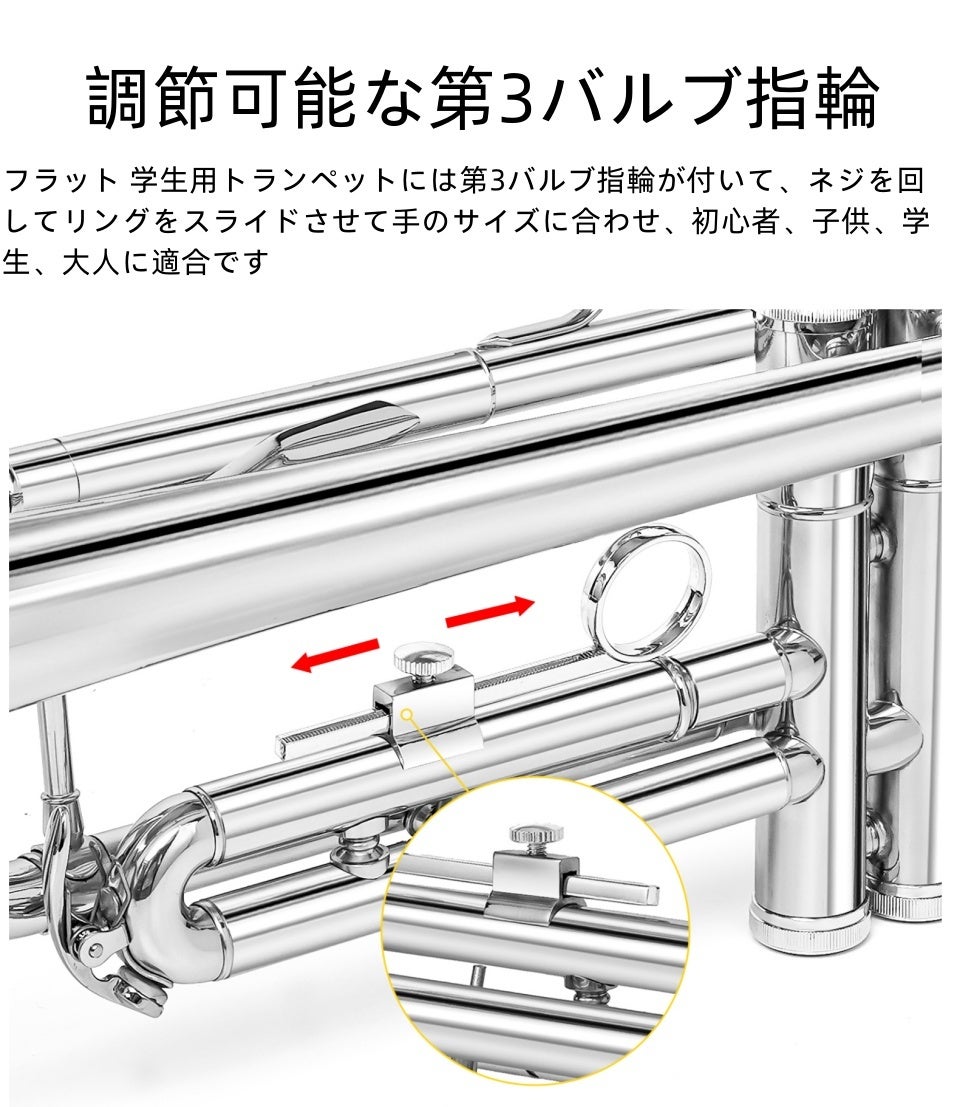 トランペットの天才は、初心者や学生には Bb 標準の真鍮製トランペットを推奨しています。この真鍮製トランペットの全体的なデザインにあります。理想的な長さ、適切なベル サイズ、ピストンの動きが簡単な 3 バルブ デザイン、調整可能な第 3 指リング、軽量など、初心者がトランペットの音に夢中になるのに最適な機能の一部です。