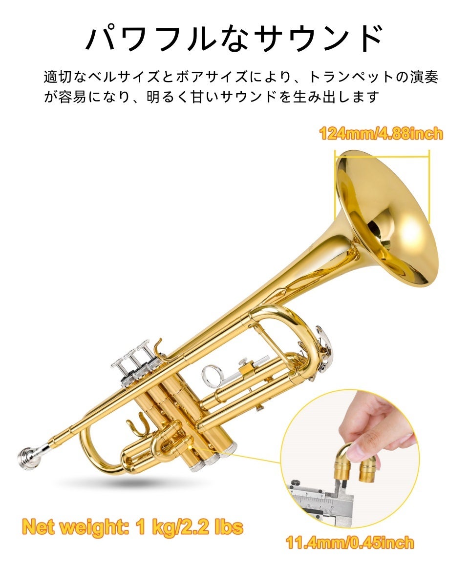 Vangoa は、Bb カテゴリーで最高級の真鍮製トランペットを製造しています。新人ミュージシャンや初心者を念頭に置いて設計されています。本体は耐久性のある真鍮製で、扱いやすく持ち運びも簡単です。4.8 インチのベルと 0.45 インチのボアは、完璧でバランスの取れた音を出すのに最適です。