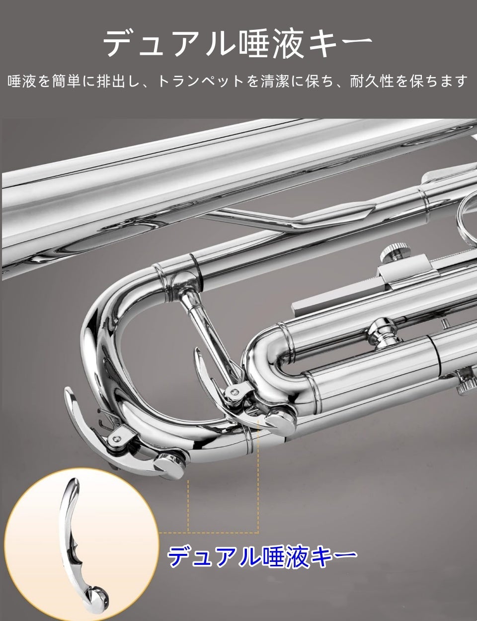 このトランペットは真鍮、ステンレス、銅を組み合わせて作られており、耐久性に優れています。通常、演奏すると唾液がトランペットの内側に溜まり、当然のことながら内側からトランペットが錆びます。この 3 つの強力な機能により、錆びるリスクが軽減され、トランペットを長期間新鮮に保つことができます。さらに、2 つの独立したウォーター キーにより、トランペットに唾液が入りません
