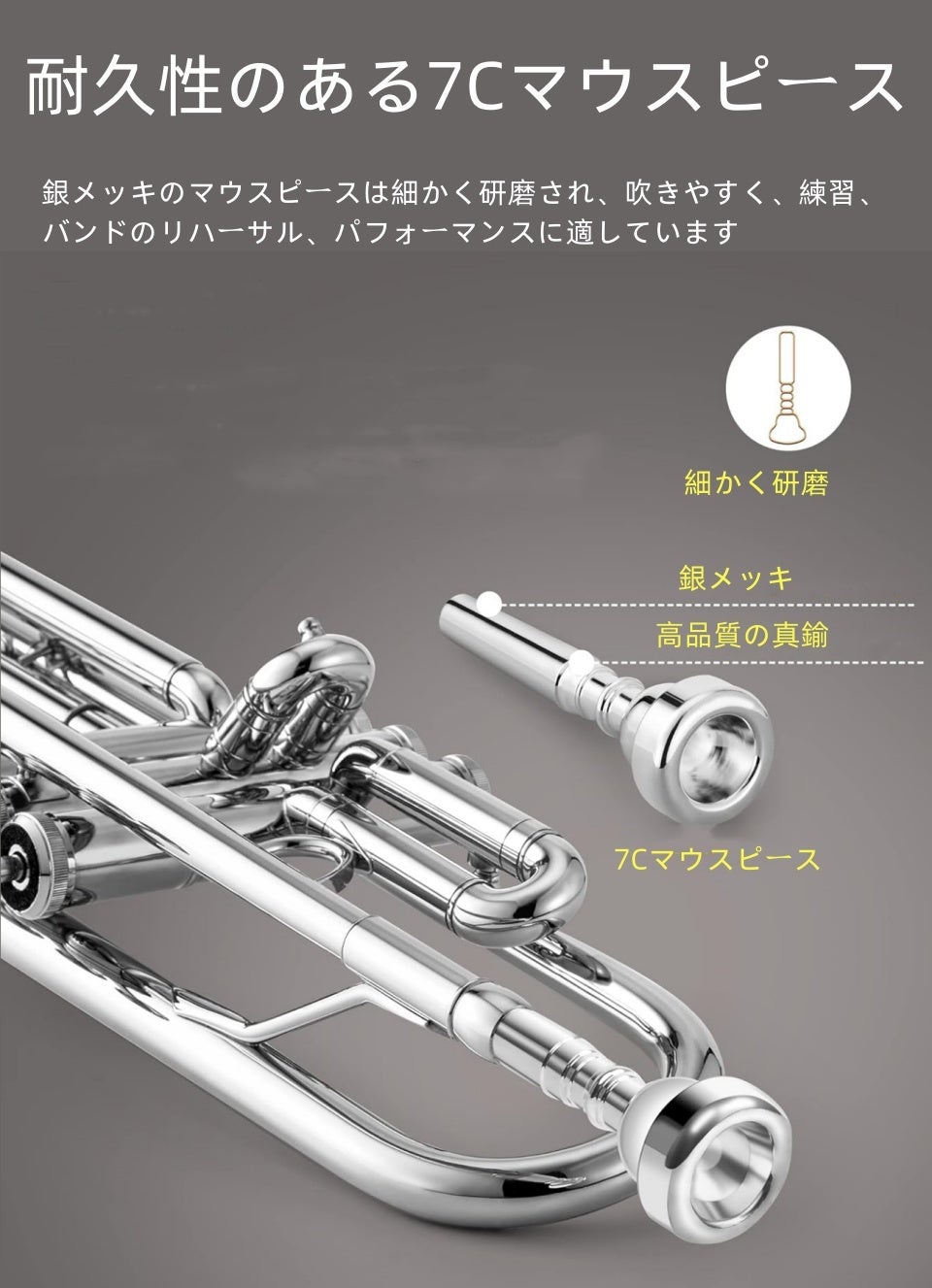 Vangoa トランペットのマウスピースは、中サイズのカップ形状に設計されています。7C の寸法は、リムの深さと直径を決定します。このリム サイズは、楽器に吹き込みやすいため、初心者や子供に最適です。