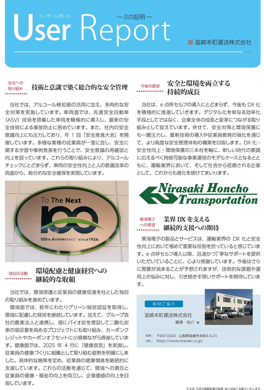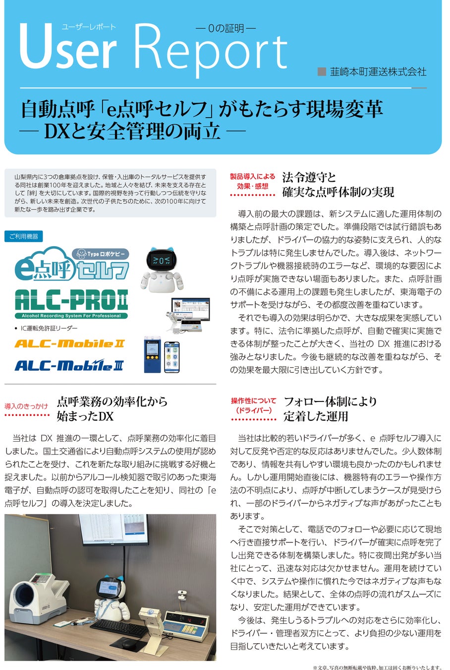 アルコール検知システム、点呼システム、運行管理システム、安全運転管理システムを開発・販売する東海電子株式会社(本社:静岡県富士市 代表取締役:杉本哲也)は、クラウド自動点呼システム「e点呼セルフ Typeロボケビー」を導入された 韮崎本町運送株式会社様に取材を行い、その内容を導入事例レポートとして公開しました。