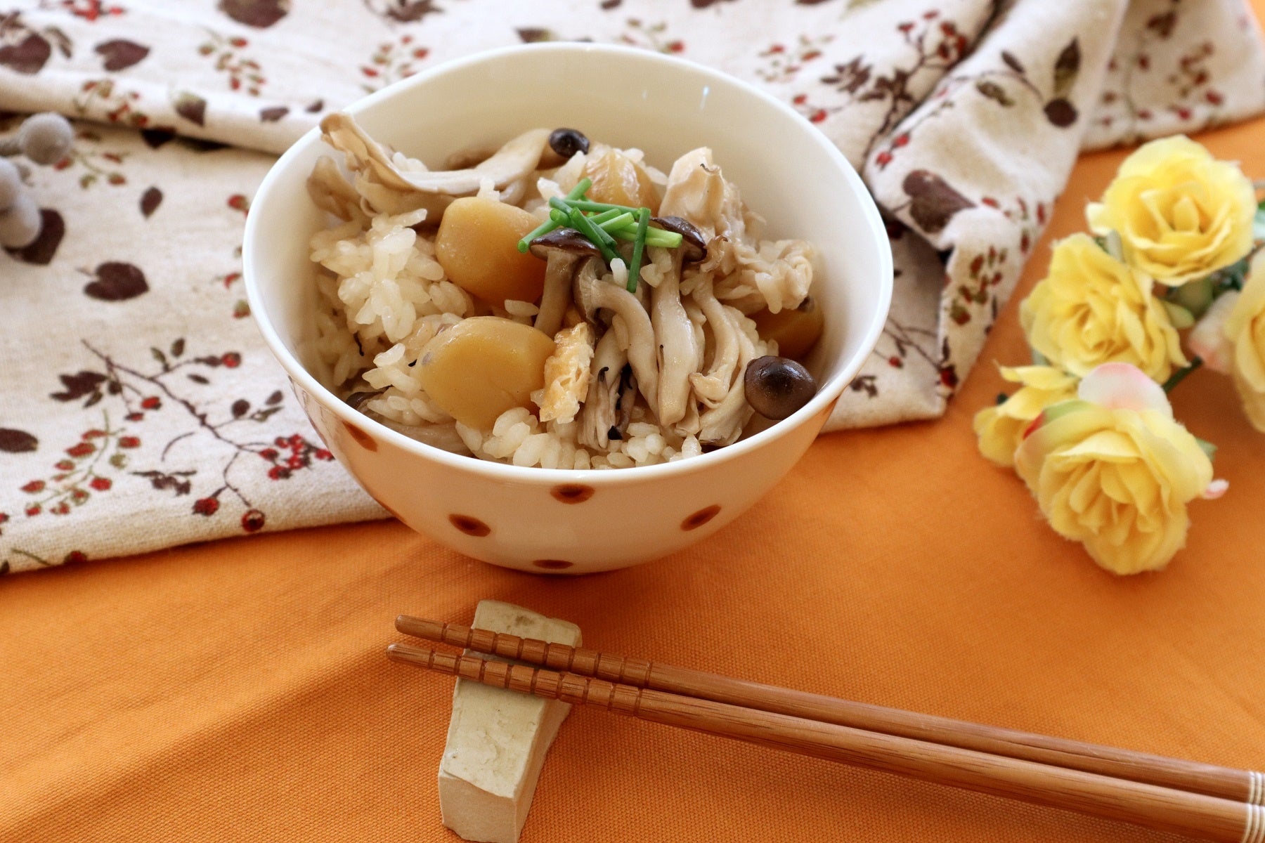 きのこと栗をたくさん入れておいしい炊き込みご飯を作っていただきます。