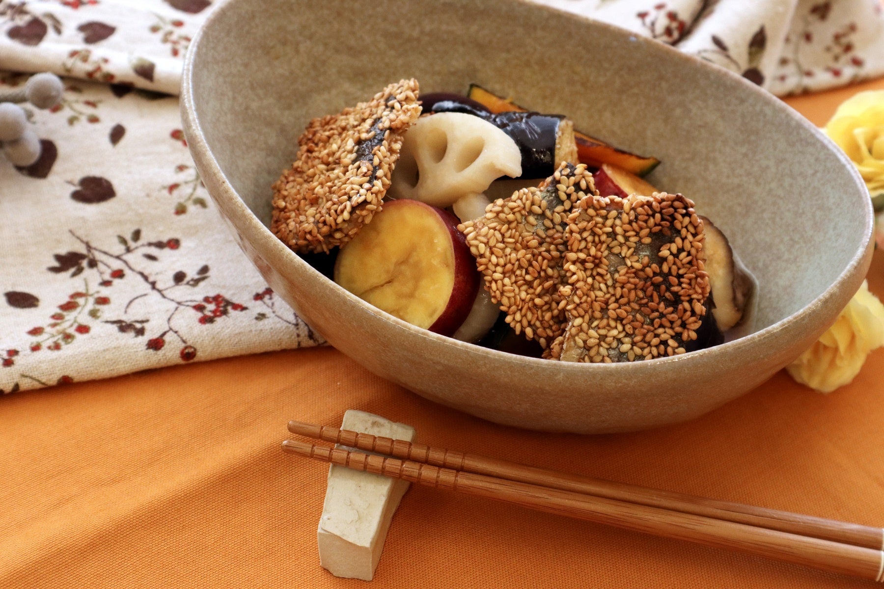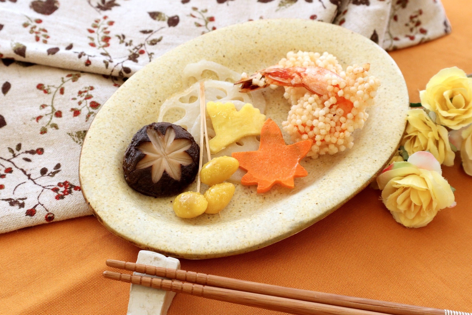 秋の味覚をカリッと美味しく揚げて仕上げます。見た目も秋らしく仕上げます。