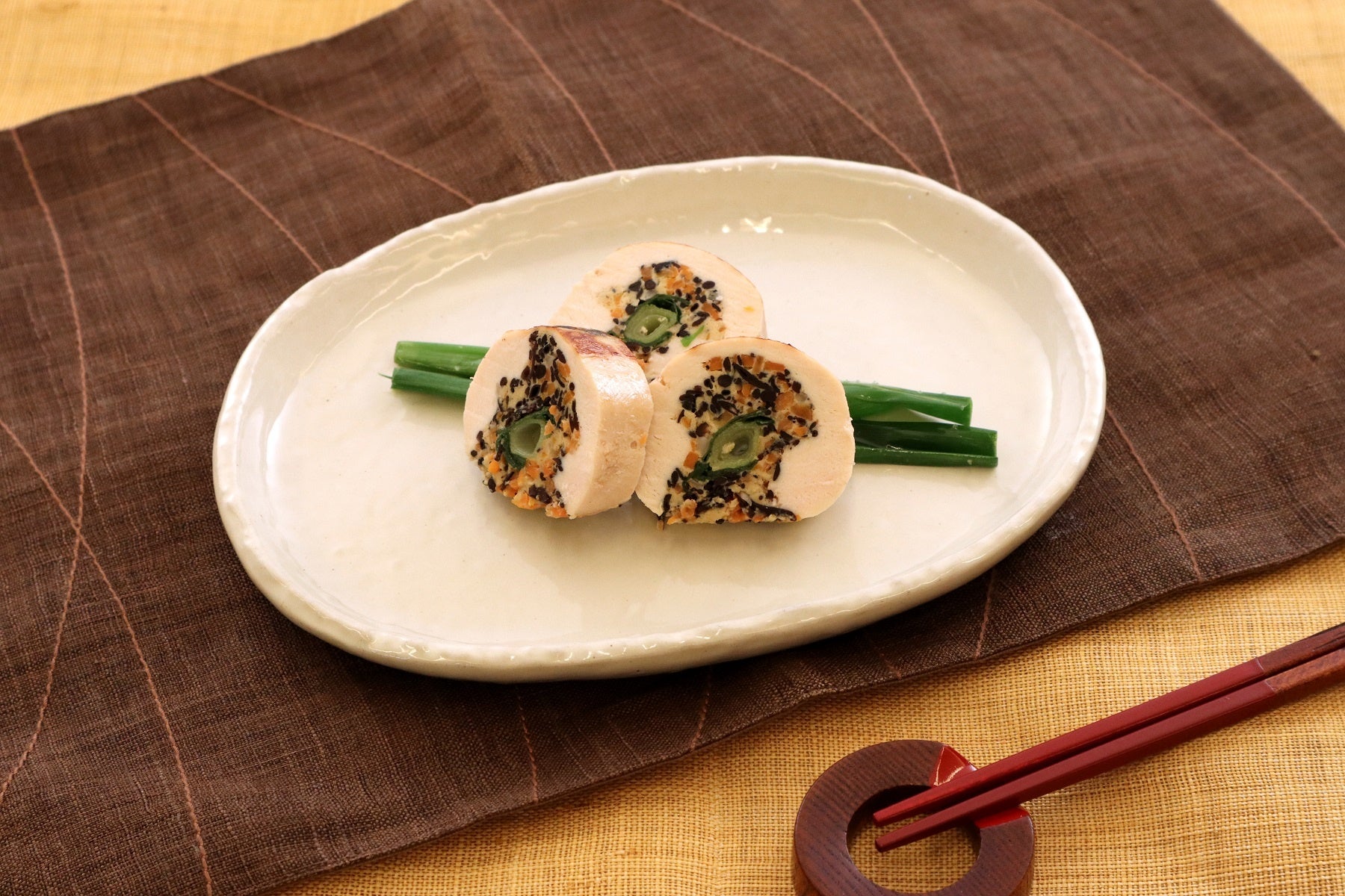 鶏胸肉にふわふわの玉子と京水菜・京人参などの京野菜を包んだ一品です。