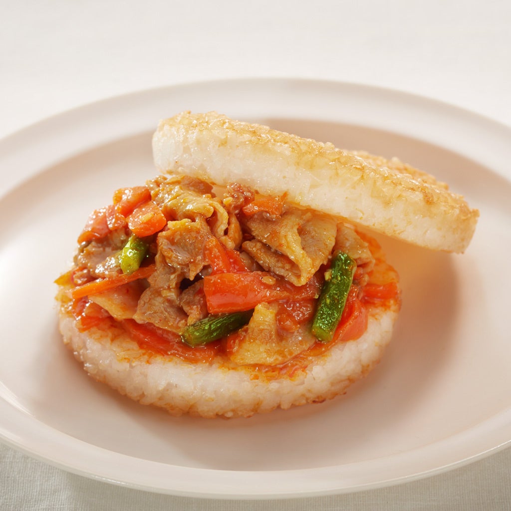 台湾の郷土料理である魯肉飯(ルーローハン)を日本風にアレンジし、冷凍モスライスバーガーとして仕立てました。カットした豚バラ肉や玉ねぎ、乾しいたけなどの具材を、醬油、清酒、砂糖、にんにく、五香粉、唐辛子などで炒めて煮込み、五香粉の香りを出しながら甘辛く仕上げました。日本人の味覚に合わせて食べやすい味わいにするため、乾しいたけやしいたけエキスで旨みと風味をプラスしています。仕上げにチンゲン菜をトッピングし、食感と彩りも加えています。