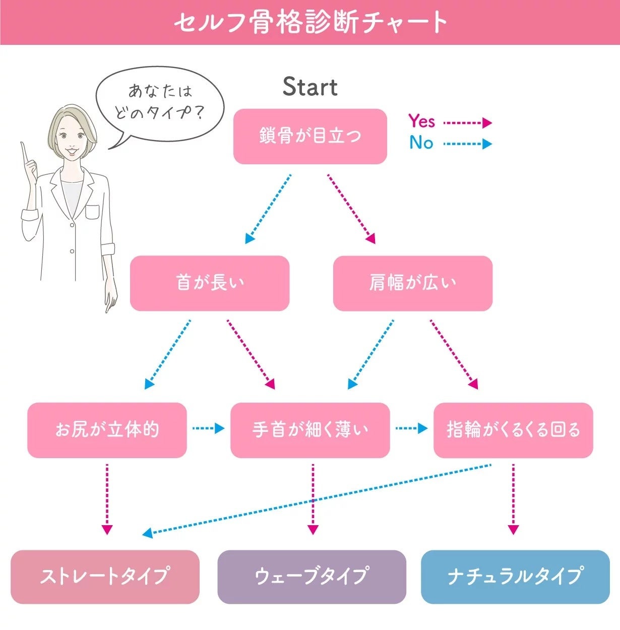 自分の骨格タイプが気になる!という方は、下の骨格診断チャートで、是非確認してみてください♪