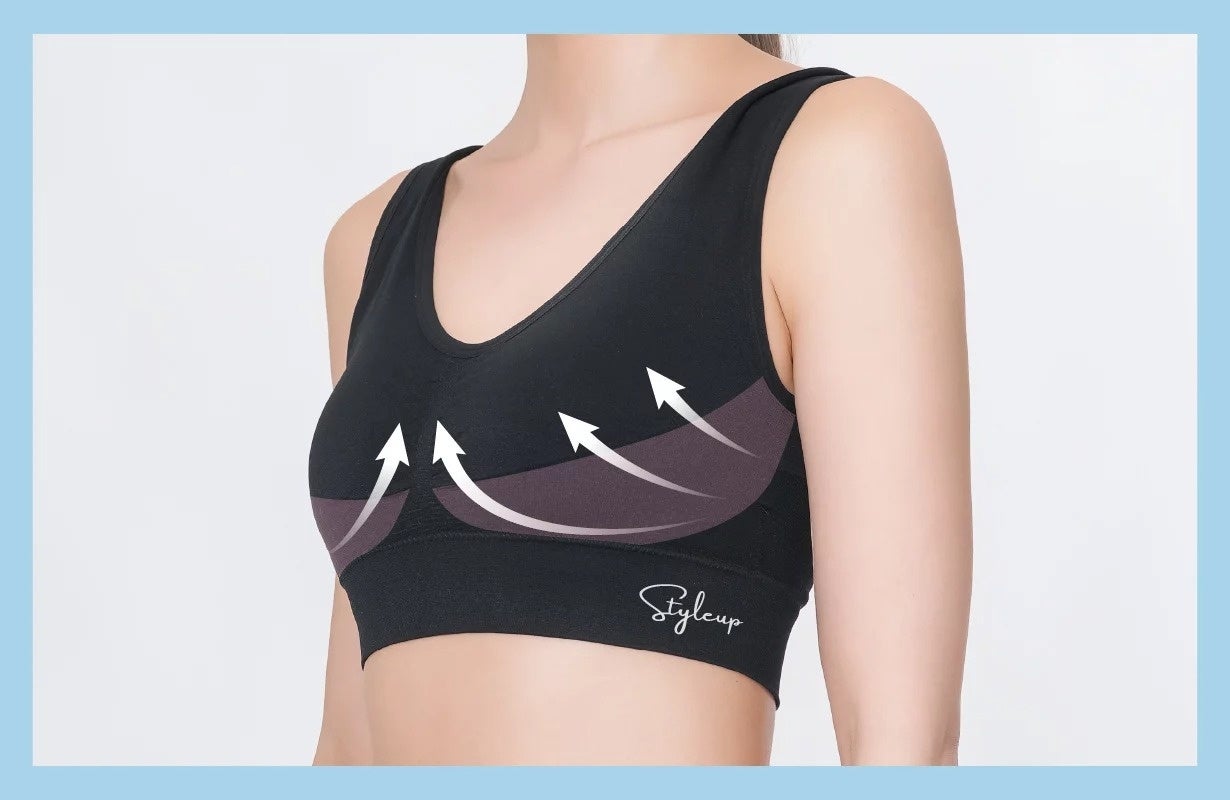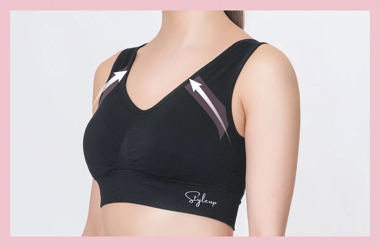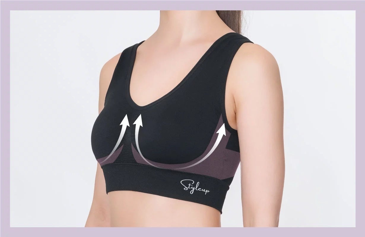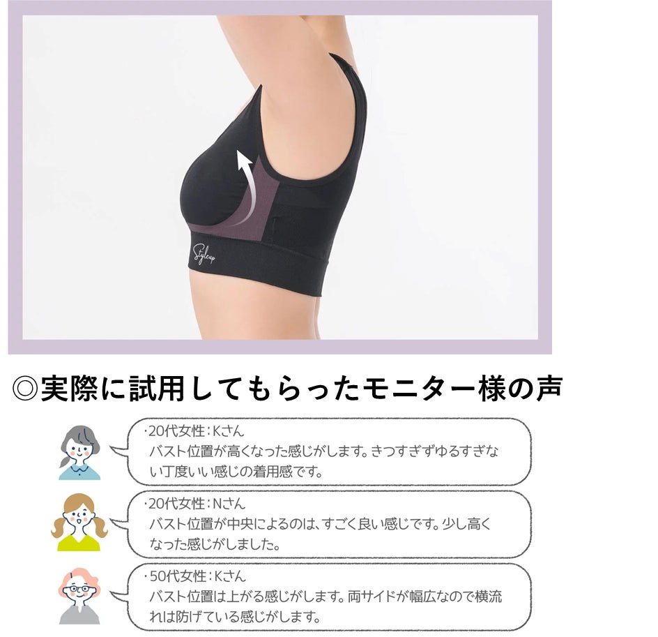 幅広の着圧でバストを下方から全体的に持ち上げ、下にお肉が逃げにくくします。
