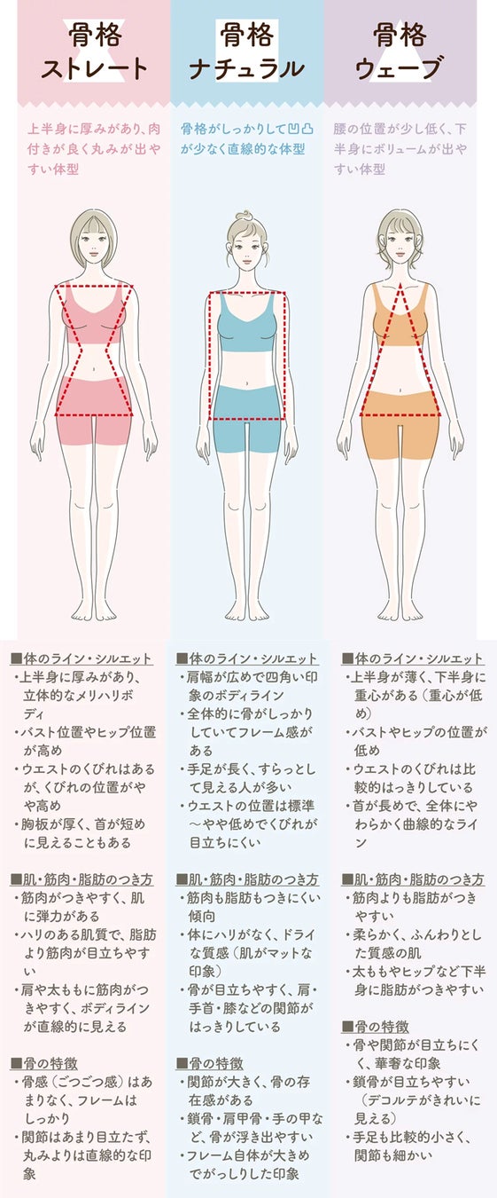 骨格タイプによって、体のラインの見え方や悩みはさまざまです。