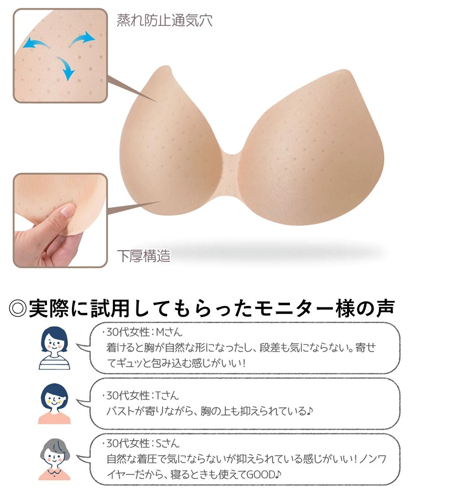 程よく下厚構造になったパッドが、バストを下から持ち上げキープ。一体型なのでバストが流れにくい♪(パッドは3タイプ共通)