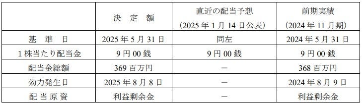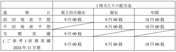 引き続きグループ中長期ビジョン(Astena 2030 “Diversify for Tomorrow.”)の目標達成に向けて各種施策に取り組んでいくことを勘案し、2025年11月期の中間配当は、当初予想通り1株当たり普通配当9円00銭とさせていただきます。なお 2025年11月期の期末配当についても、1株当たり9円00銭での実施を予定しております。