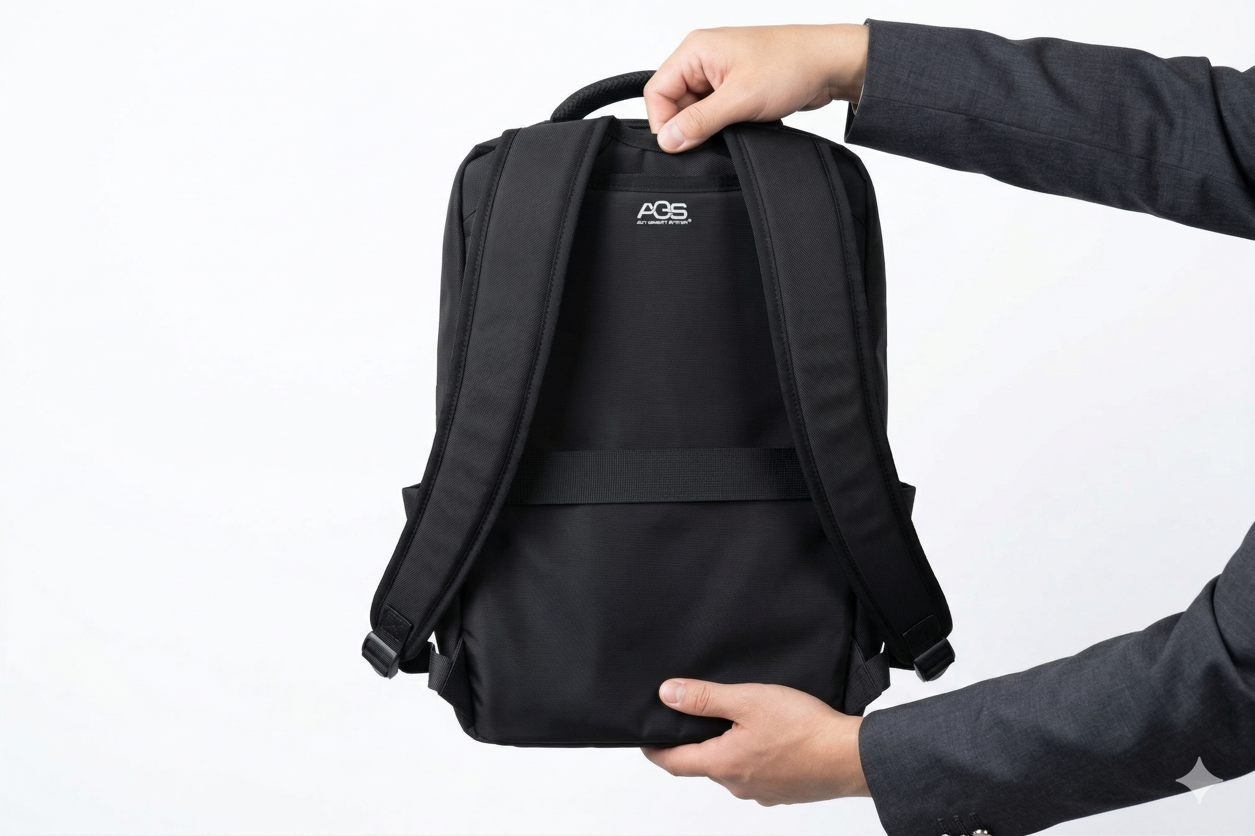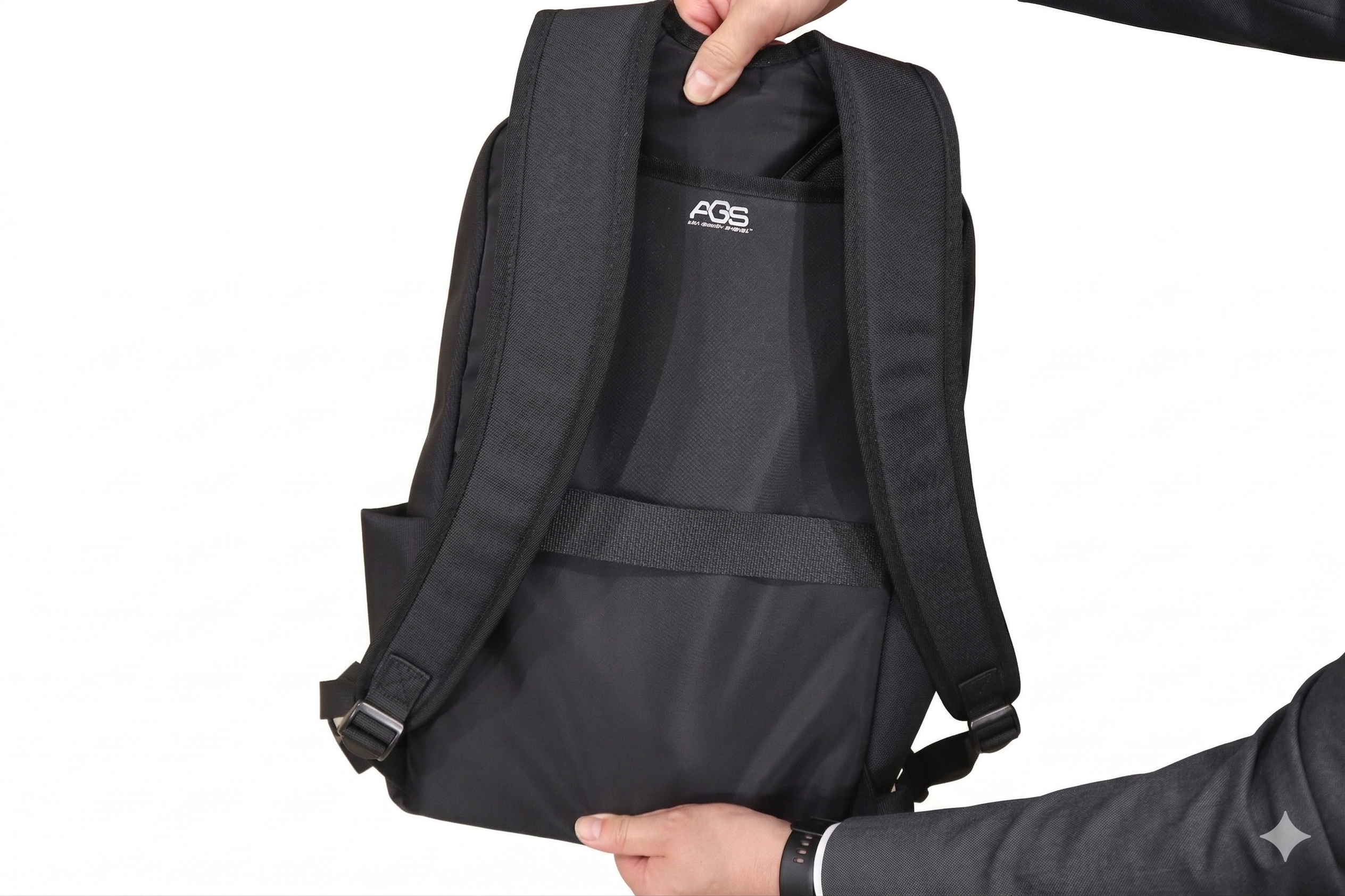 本商品は、自動車のサスペンション構造をヒントに開発したAGS(サスペンション機構)※を背面に搭載しています。歩行時の動きに合わせてリュックが上下に動くことで、肩や腰にかかる瞬間的な荷重を分散し、体感重量を約40%軽減します。さらに、正しい姿勢を維持できる設計にしているため体全体への負担を軽減するなど、PCを持ち歩くビジネスパーソンに最適です。その他、撥水加工を施しており、昨今の予測しにくい急な雨でも安心して使用することができます。