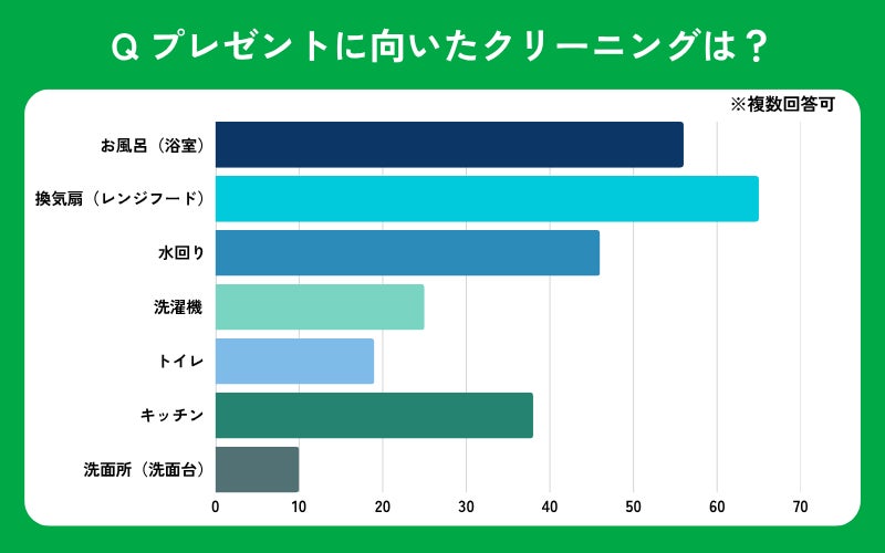 ・他にプレゼントになりそうなクリーニング箇所は「お風呂(浴室)」「換気扇(レンジフード)」。