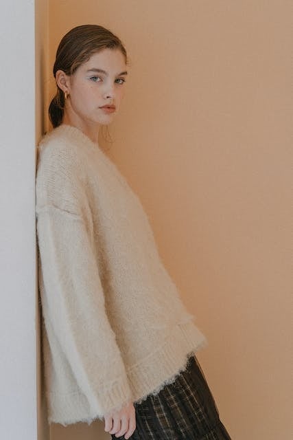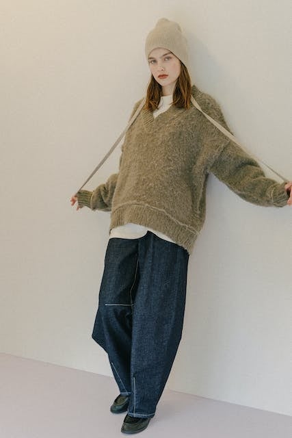 すっきり見せるVネックとぽてっとした袖がポイント。着るだけでサマになるゆるニット。