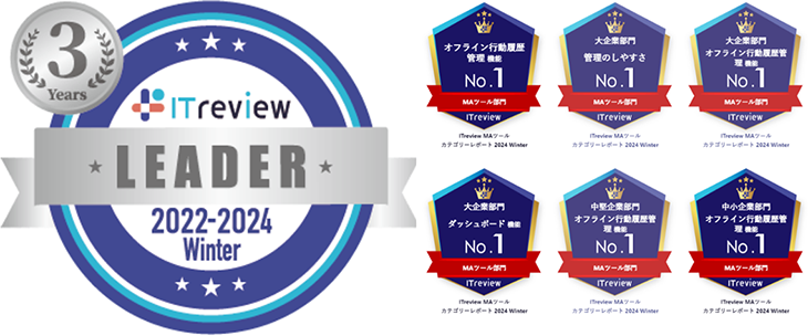 また、MAツール部門のすべての部門において、オフライン行動履歴管理でNo.1を獲得したほか、大企業部門では3項目でNo.1を獲得(管理のしやすさ、オフライン行動履歴管理、ダッシュボード)、中堅企業部門・中小企業部門では共にオフライン行動履歴管理でNo.1を獲得、しています。