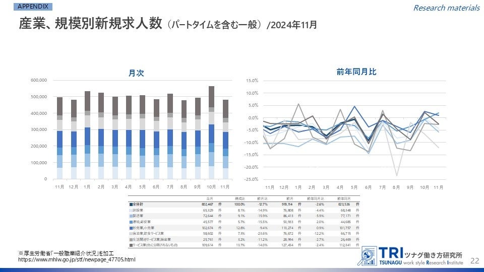 株式会社ツナググループ・ホールディングス(本社:東京都中央区、代表取締役社長:米田 光宏)を母体とする、多様な働き方の調査研究機関「ツナグ働き方研究所(拠点:東京都中央区、所長:大野 博司)」は、官公庁などが発表する労働市場関連のデータをキュレーションしつつ、分かりやすくまとめた「労働市場データレポート」を毎月発表しています。今回は12月下旬に発表された最新データをもとに2024年11月度のレポートについてとりまとめましたのでご報告いたします。