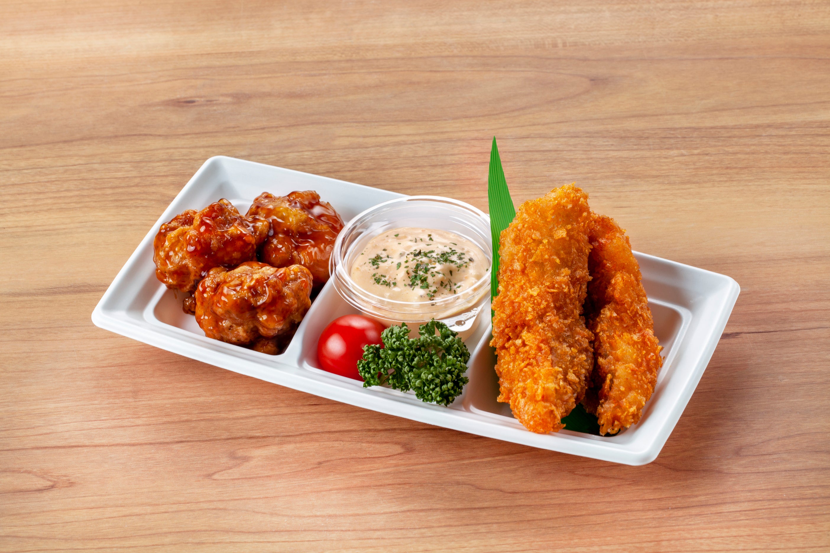 お弁当でも大人気の若鶏のチキン南蛮と白身魚のフライがタルタルソースとセットになったお得な一皿です。