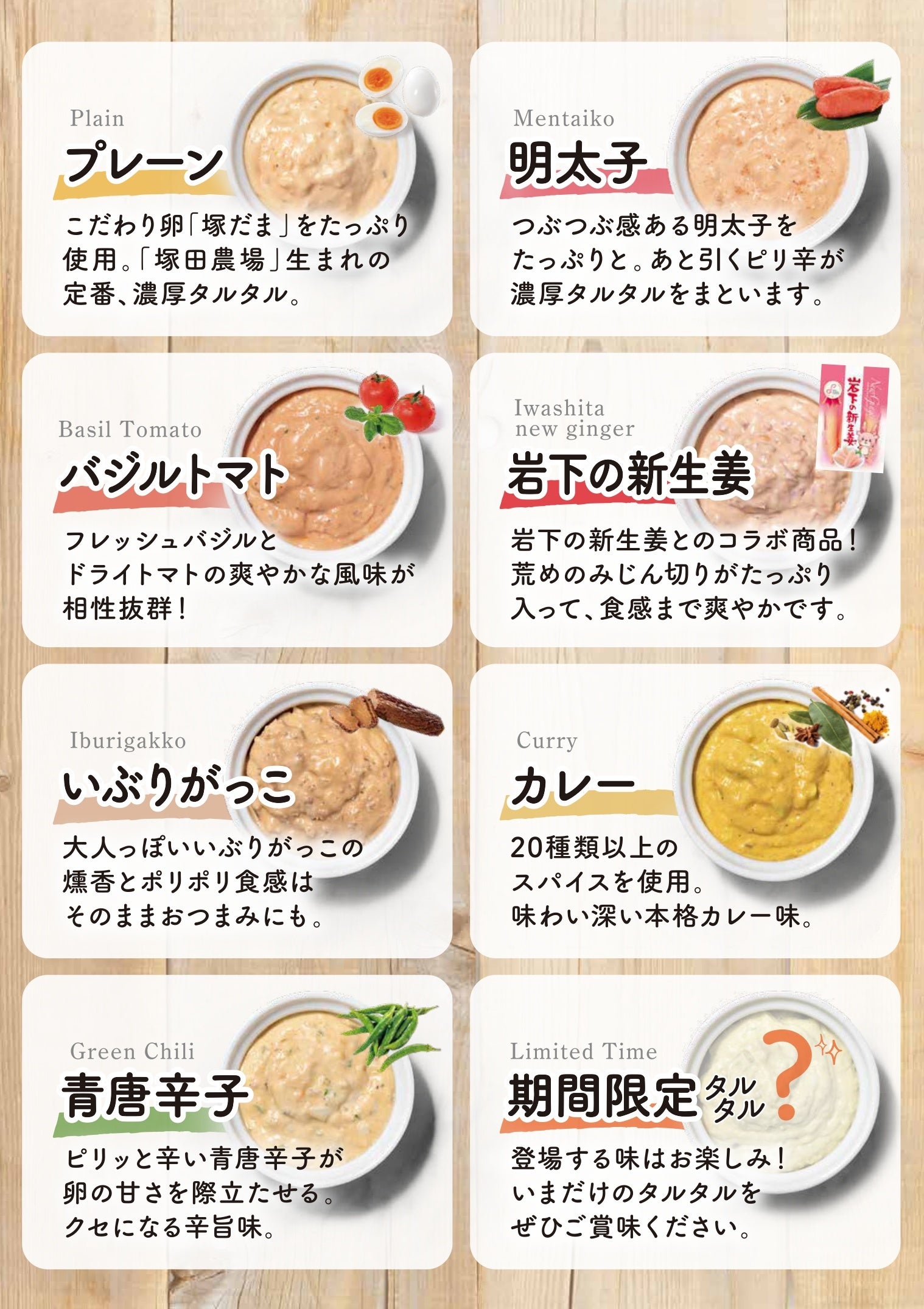 プレーン/明太子/バジルトマト/岩下の新生姜/いぶりがっこ/カレー/青唐辛子/