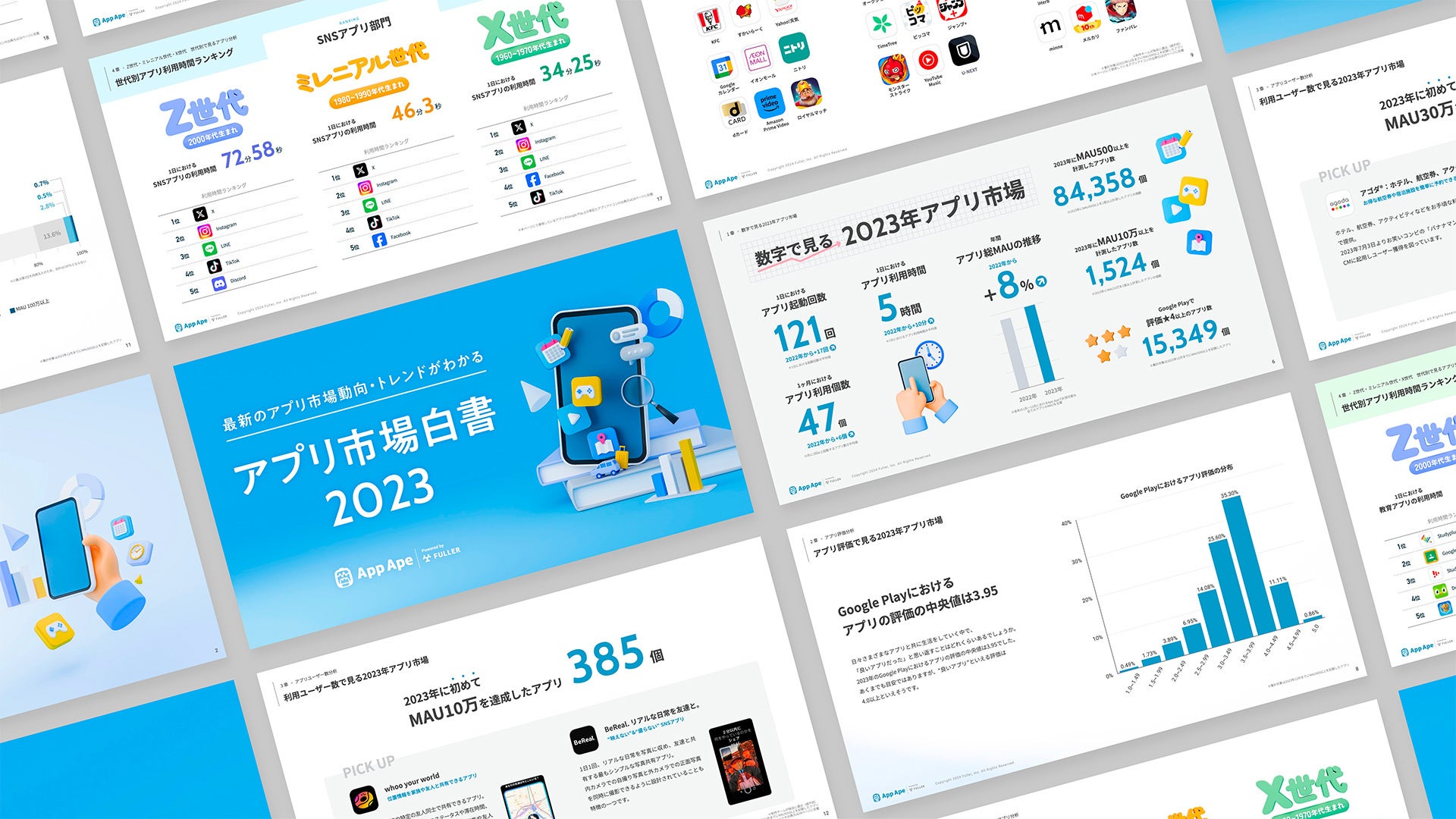 2023年のアプリ市場動向を振り返るとともに、アプリストアにおける評価分析やアプリユーザー数分析、Z世代やミレニアル世代といった世代ごとのアプリ分析など、さまざまな視点でアプリデータを調査。アプリを取り巻くユーザーの“いまの姿”を浮き彫りにすることを重視しました。