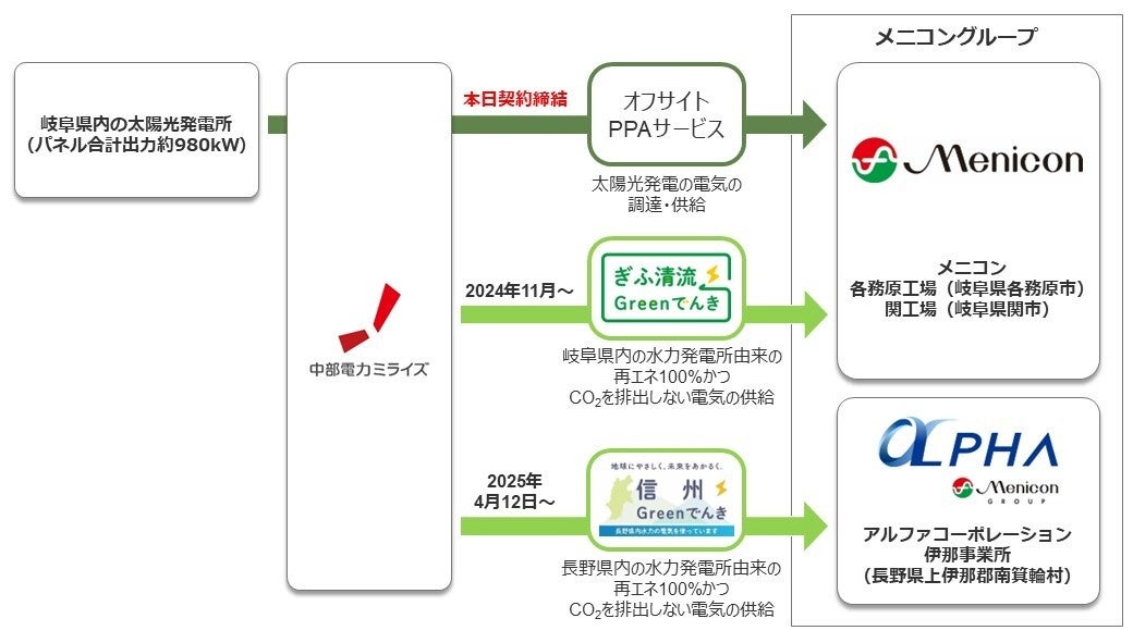 本サービスは、中部電力ミライズが、岐阜県内に新たに設置される太陽光発電所(パネル合計出力:約980kW、年間想定発電量:約110万kWh)から調達する電気を、メニコン各務原工場(岐阜県各務原市)・関工場(岐阜県関市)に供給するものです。