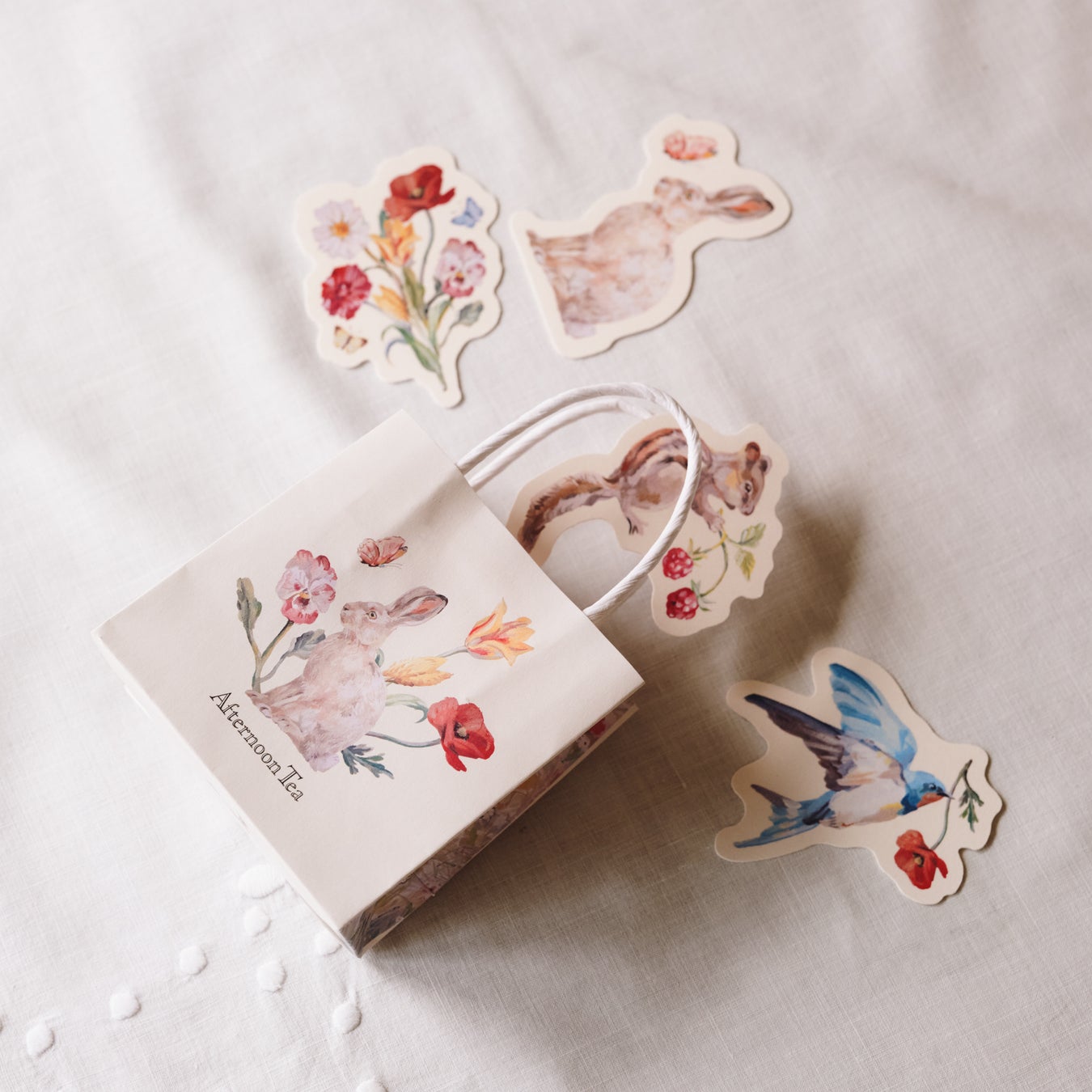 庄島歩音氏の春の訪れを感じるアートをあしらった限定ラッピングより、プチギフトにぴったりなSSサイズのショッパーやコットン巾着を新たにご用意いたしました。(画像左)