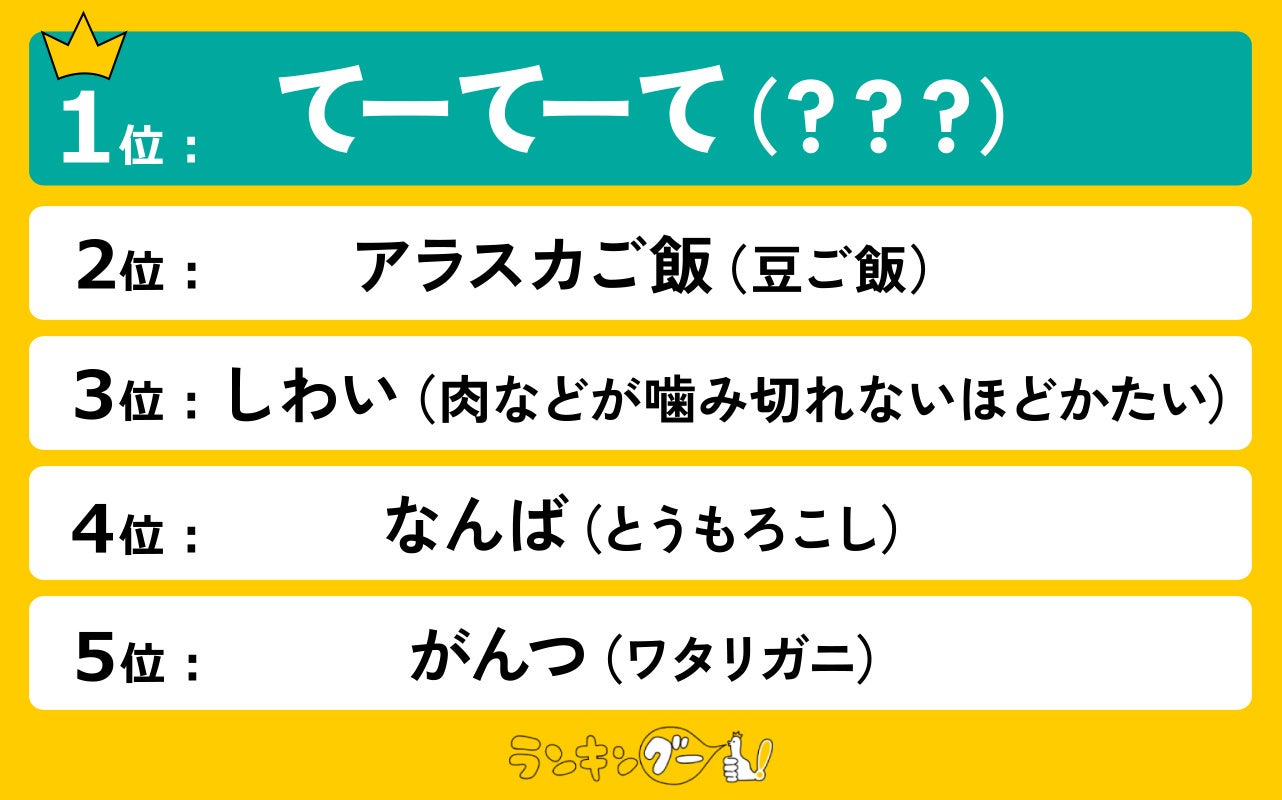 1位は1,340票を獲得した「煮ておいて」という意味の『てーてーて』に決定!2位は「豆ご飯」を意味する『アラスカご飯』。3位は「肉などが噛み切れないほどかたい」という意味の『しわい』。4位は「とうもろこし」を意味する『なんば』。そして、5位は「ワタリガニ」を意味する『がんつ』がランクインしました!