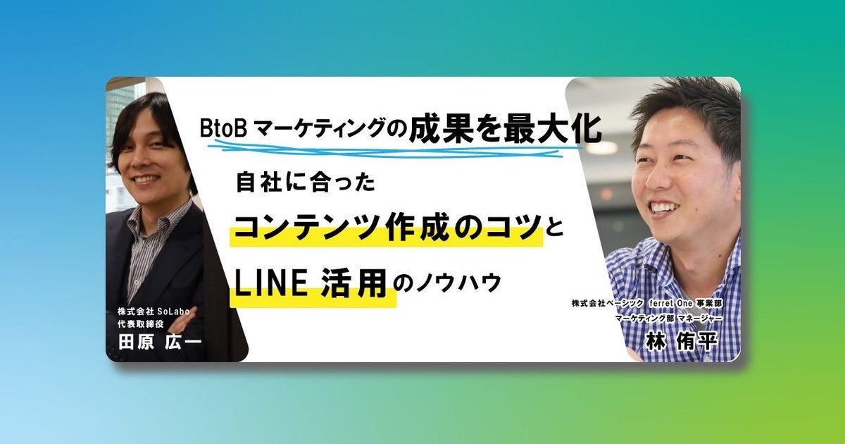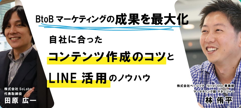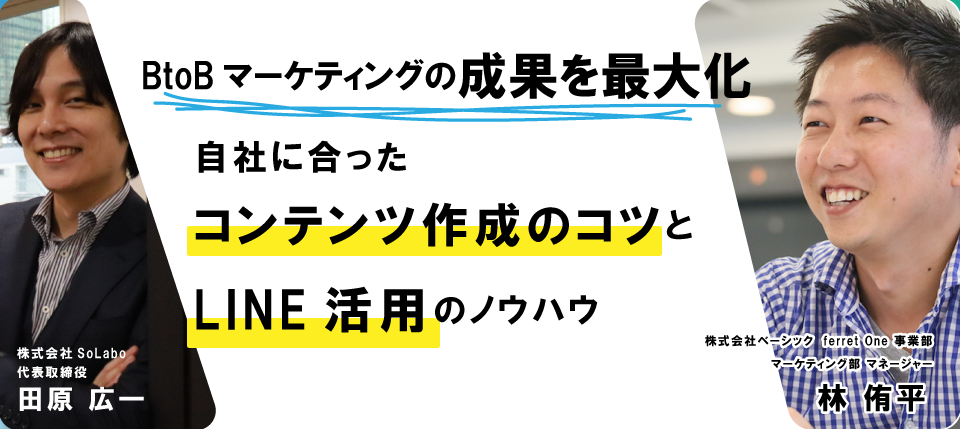 BtoBマーケティングのお困りごとをまるっと解決するサービス『ferret One(フェレットワン)』を運営する株式会社ベーシック(本社:東京都千代田区、代表取締役:秋山勝、以下「当社」)は株式会社SoLabo(本社:東京都千代田区、代表取締役:田原広一、以下「SoLabo社」)と、2/28(火)15時よりWebマーケティングを強化したい方に向けたセミナー「BtoBマーケティングの成果を最大化 自社に合ったコンテンツ作成のコツとLINE活用のノウハウ」を開催いたします。