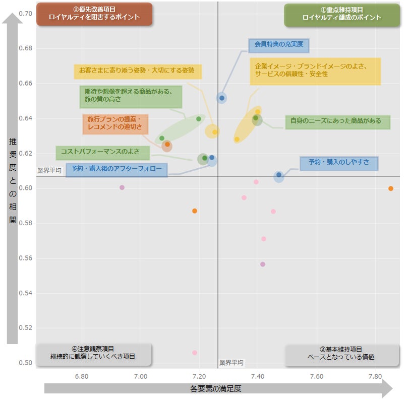 一方でロイヤルティ向上のために優先的に改善が期待される項目としては「旅の質の高さ(現地を含めたスタッフの対応、品質や内容など)」や「旅行プランの提案・レコメンドの適切さ」、また「期待や想像を超える商品がある」、「コストパフォーマンスのよさ」といった旅行商品の商品性や提案の適切さに関連した項目となりました。また、「予約・購入後のアフターフォロー」、「お客様に寄り添う姿勢・大切にする姿勢」といった項目でも改善が期待される結果となりました。