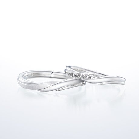 エンゲージリングとマリッジリングを重ねると美しく繋がるダイヤモンドのラインは、優しい風にのって舞い上がる優雅な花びらを表現しています。
