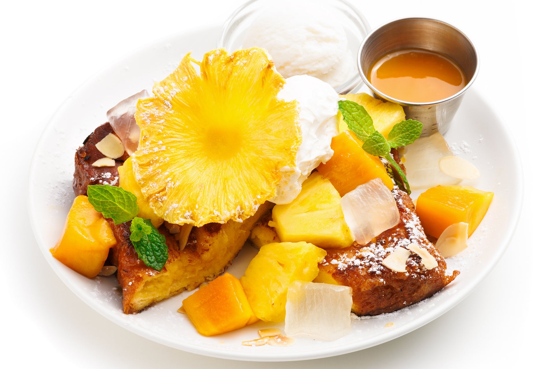 今季の新作「トロピカルフルーツ&ヨーグルト」は、ブリオッシュフレンチトーストの上に、パイナップル、マンゴーなど南国のフルーツをのせて、ヨーグルトクリームでさっぱりと仕上げました。みずみずしいアロエも食感のアクセントに。花に見立て手製したセミドライのパイナップルフラワーがまぶしい、夏気分あふれるフレンチトーストです。