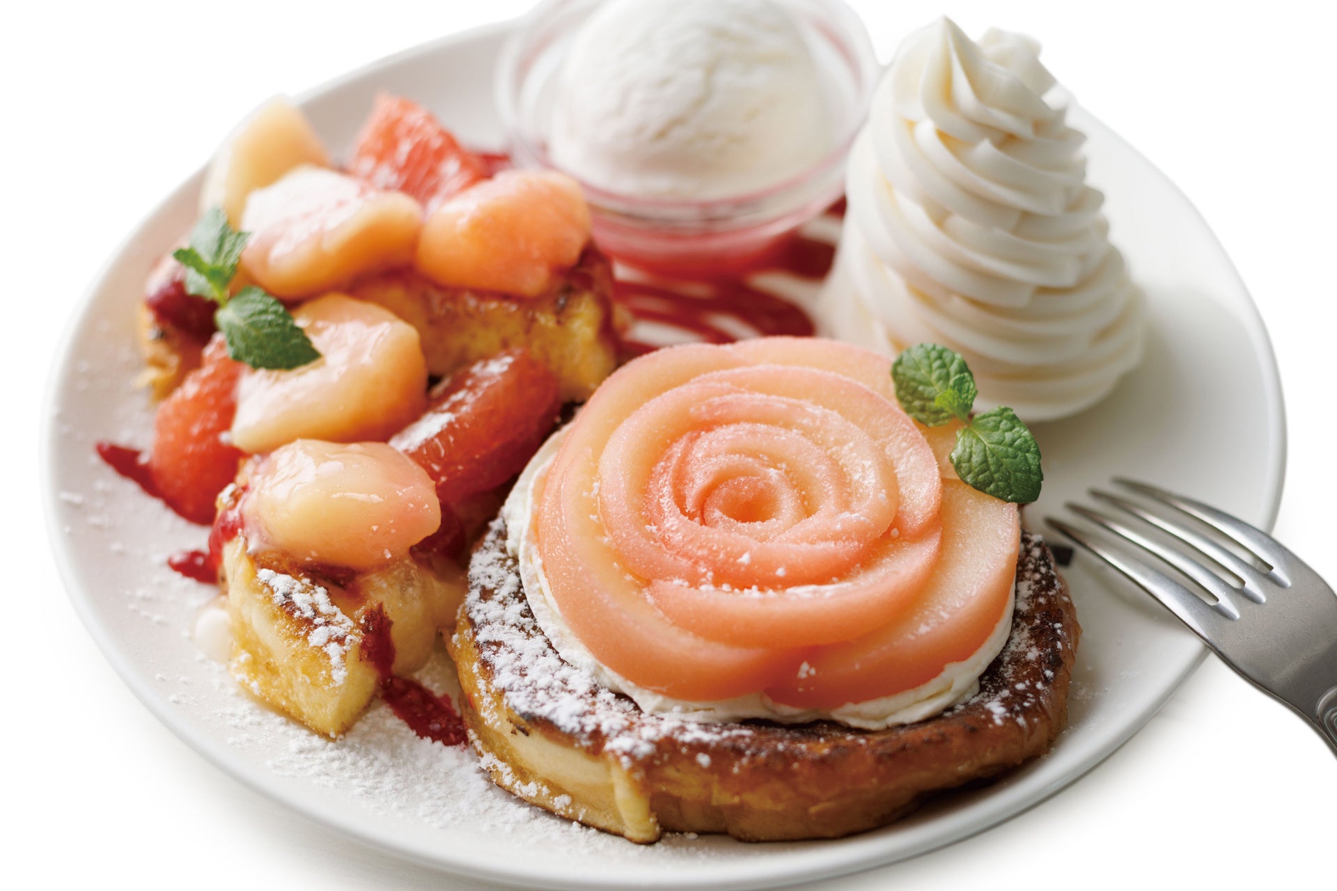 夏の定番人気「フローズンピーチフラワー」は、その名の通り、花のようにお店で飾りつけたフローズンピーチコンポート&サワークリームが目印。ピンクグレープフルーツや白桃などのフルーツでトッピングし、愛らしいピンクであふれるフレンチトーストに。あたたかいフレンチトーストとの“アツひや”コントラストもたまらないひと品です。
