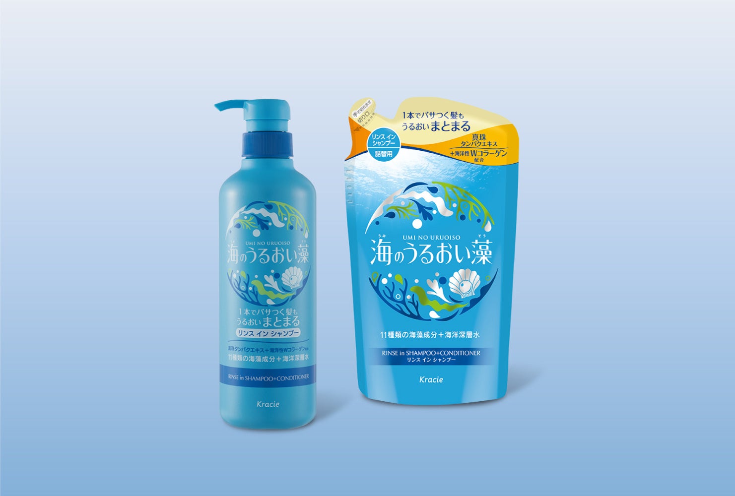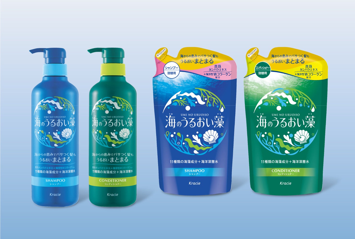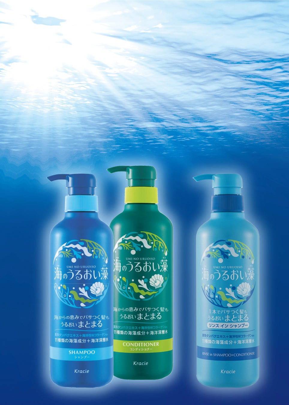 海のミネラルをたっぷり含んだ「11種類の海藻成分」と「海洋深層水」を配合し、髪に芯からうるおいを与えます。「海洋性うるおい成分(Wコラーゲン)」と新配合の「真珠タンパクエキス」で、パサつく髪も手触りなめらかに整えます。さらに、「地肌うるおい成分」を新配合し、健康的で健やかな地肌へ導きます。毎日のヘアケアで、みんなの髪と地肌をもっと健やかに美しくすると同時に、多くの恵みをあたえてくれる海を大切にしたいと思い、パッケージは環境に配慮したものを採用しました。