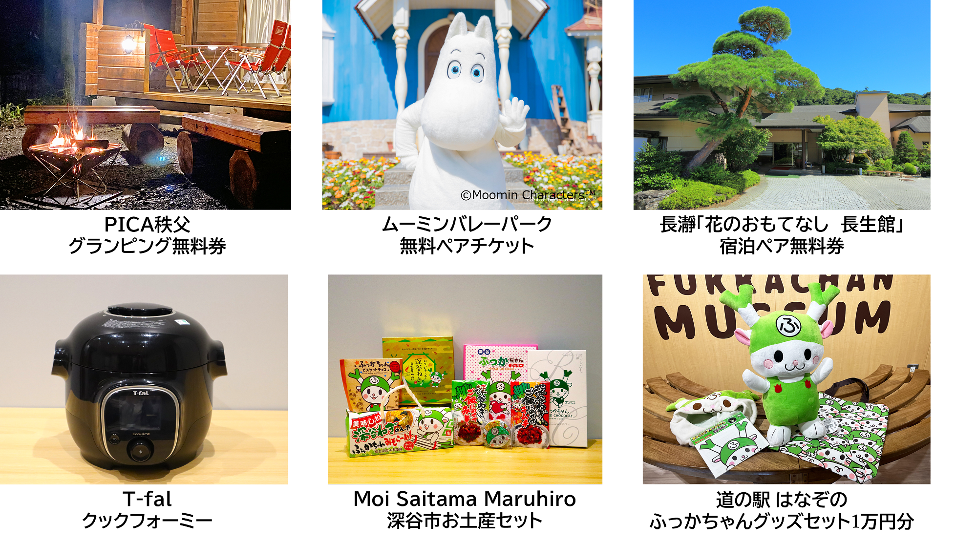 豪華賞品が当たる抽選会を開催。アウトレットお買い物券やブランド商品をはじめ、グランピング無料券やディナーペアチケット、ふっかちゃんグッズや深谷市特産品セットなど。