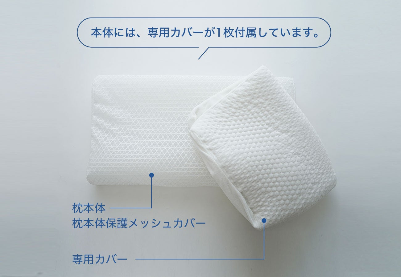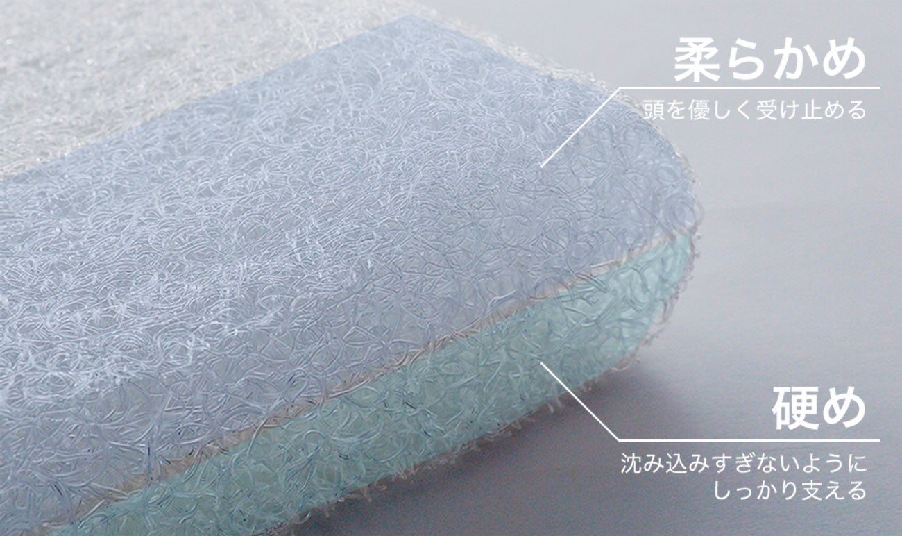 枕本体は、上層は柔らかめ、下層は硬めの2層構造。頭を優しく受け止めつつ、沈み込みすぎない構造にすることで、安定した寝姿勢を保つことができます。
