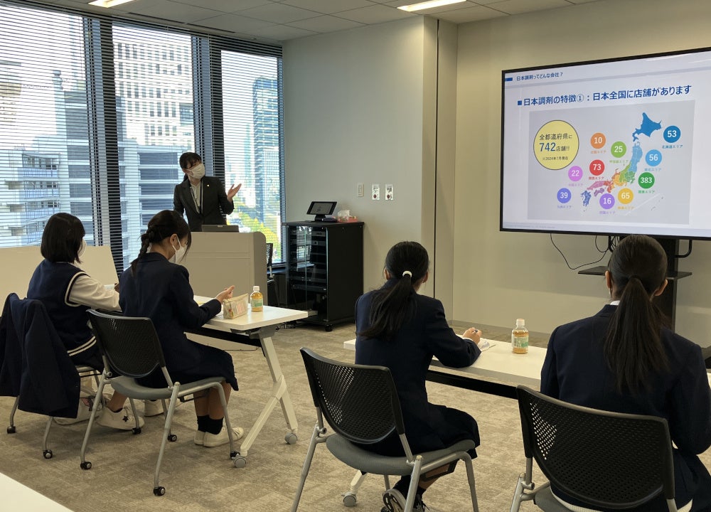 日本調剤の本社で薬局薬剤師の役割や日本調剤の事業について講義を実施。当社の『SDGsラジオ』を聴いて薬剤師という職業に興味を持ったという学生もおり、薬剤師になるための具体的なステップについても紹介しました。また、『SDGsラジオ』で得た知見をもとに、学生が日本調剤の新しいサービスを考え、提案するなど、当社の強みや現代の学生が求めるヘルスケアサービスについて活発な意見交換を行いました。
