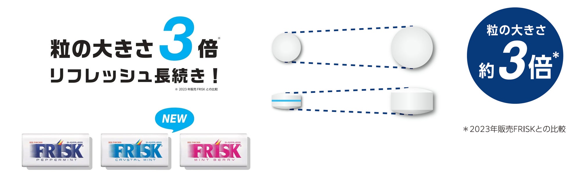 日々の「リフレッシュメント(気分転換や集中など)」を支える「FRISK」は従来製品より、粒の大きさが3倍になり、爽快感が長続き、長時間のリフレッシュをサポートします。