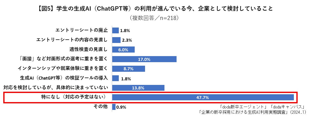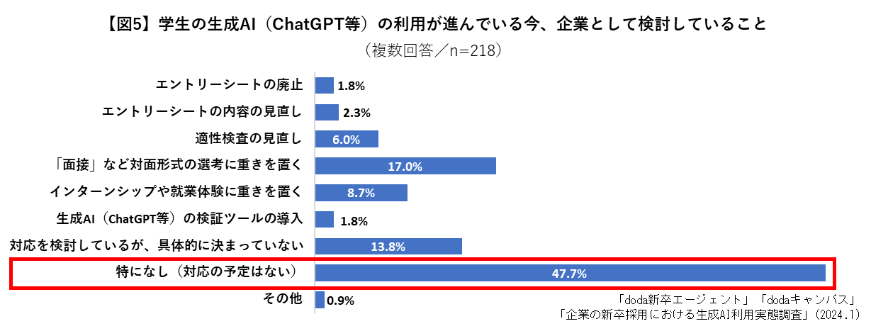 学生の生成AI(ChatGPT等)の利用が進んでいる今、対応を検討している(もしくは対応が決まっている)ことについて聞いたところ、約半数の企業が「対応の予定はない」(47.7%)と回答。何らかの対応を検討している企業においては、「『面接』など対面形式の選考に重きを置く」(17.0%)、「対応を検討しているが、具体的に決まっていない」(13.8%)が上位となりました。【図5参照】