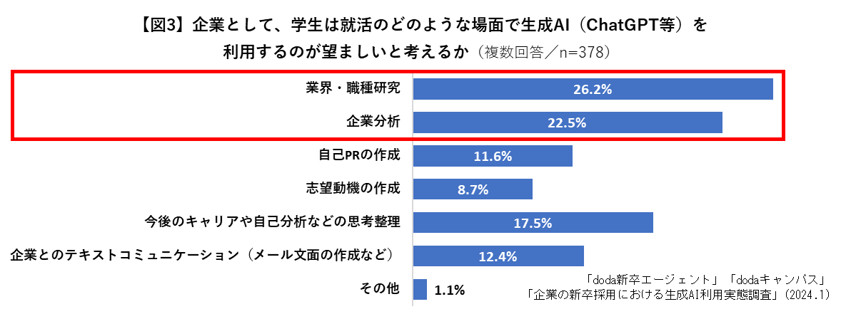 ・企業側は、学生が就活のどのような場面で生成AI(ChatGPT等)を利用するのが望ましいと考えるかについては、1位「業界・職種研究」(26.2%)、2位「企業分析」(22.5%)
