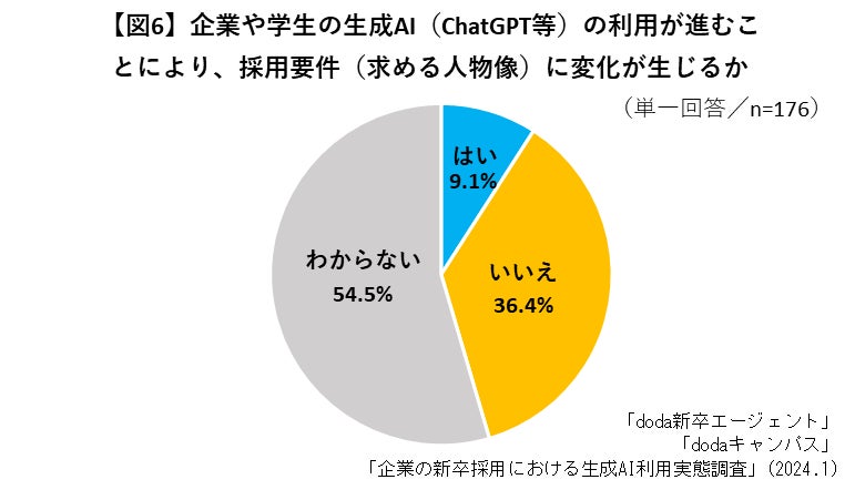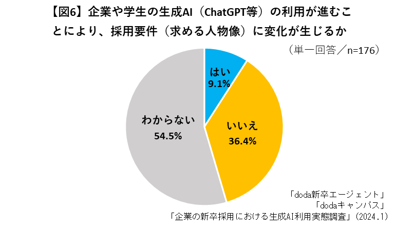 企業や学生の生成AI(ChatGPT等)の利用が進むことにより、採用要件(求める人物像)に変化が生じるかについては、半数以上が「わからない」(54.5%)と回答。また、「いいえ」(36.4%)が「はい」(9.1%)を大きく上回る結果になりました。【図6参照】