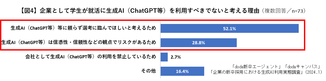 一方で、学生が就活で生成AI(ChatGPT等)を利用すべきでないと回答した企業にその理由を聞いたところ、半数以上の企業が「生成AIに頼らず選考に臨んで欲しいと考えるため」(52.1%)と回答しています。【図4参照】