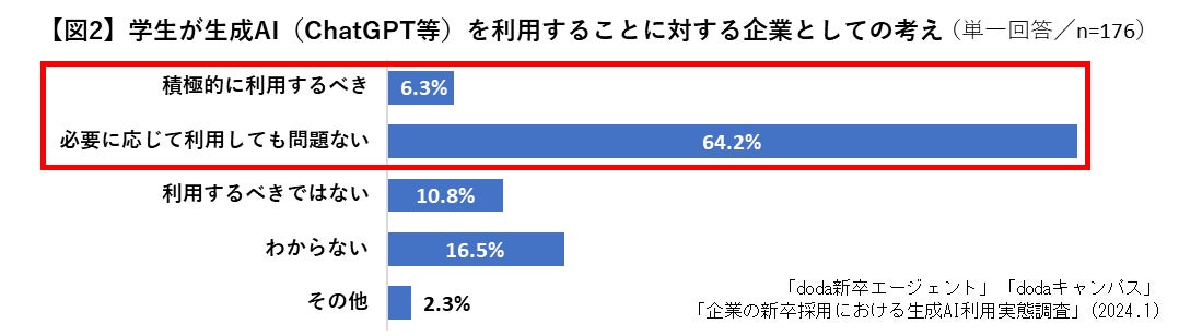 学生の生成AI(ChatGPT等)利用について企業の考えを聞いたところ、「積極的に利用するべき」(6.3%)「必要に応じて利用しても問題ない」(64.2%)となり、約7割の企業が利用に肯定的であることがわかりました。【図2参照】