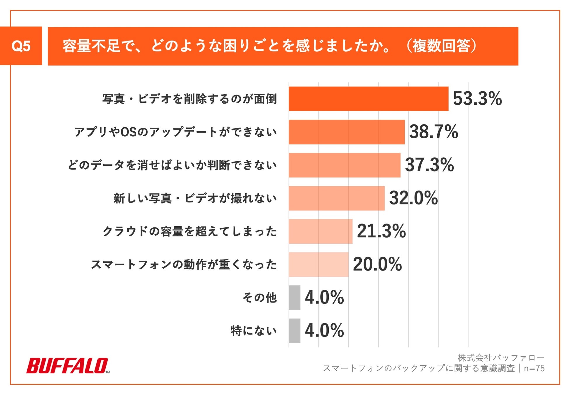 Q4で「よくある」「たまにある」と回答した方に、「Q5.容量不足で、どのような困りごとを感じましたか。(複数回答)」(n=75)と質問したところ、「写真・ビデオを削除するのが面倒」が53.3%、「アプリやOSのアップデートができない」が38.7%、「どのデータを消せばよいか判断できない」が37.3%という回答となりました。