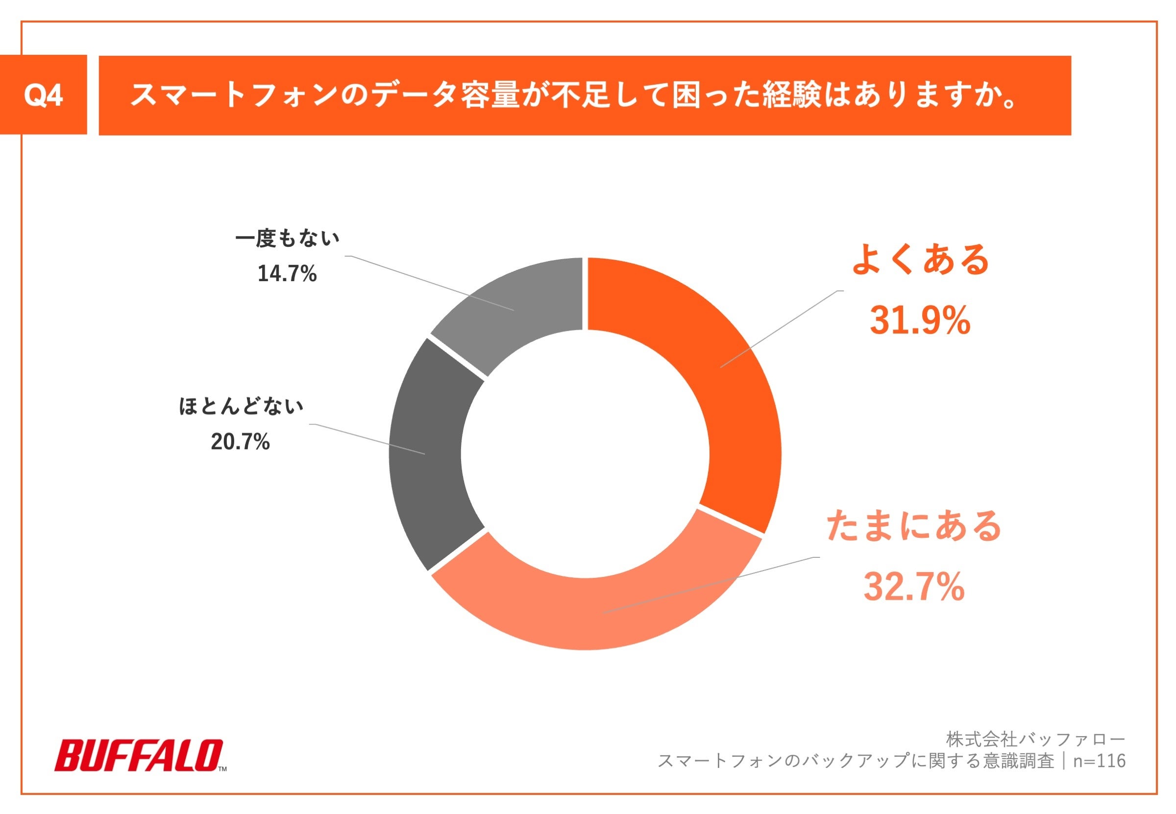 「Q4.スマートフォンのデータ容量が不足して困った経験はありますか。」(n=116)と質問したところ、「よくある」が31.9%、「たまにある」が32.7%という回答となりました。