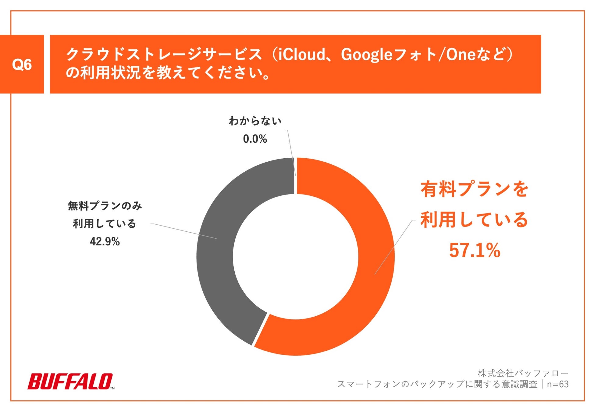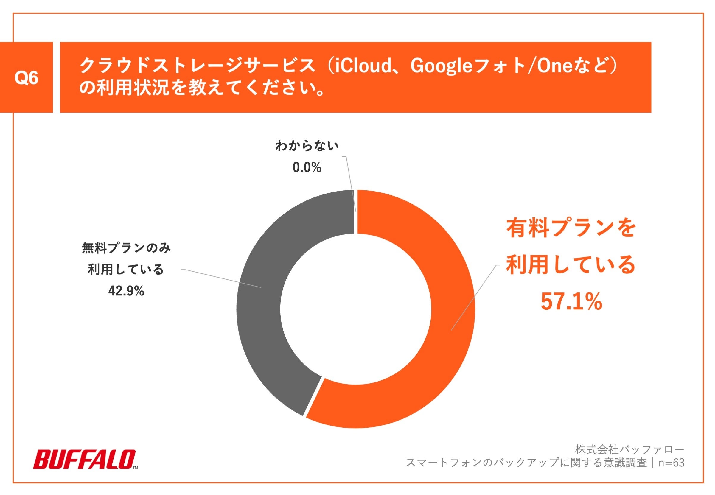 Q1で「自動でクラウド(iCloud / Googleフォトなど)に保存されている」と回答した方に、「Q6.クラウドストレージサービス(iCloud、Googleフォト / Oneなど)の利用状況を教えてください。」(n=63)と質問したところ、「有料プランを利用している」が57.1%、「無料プランのみ利用している」が42.9%という回答となりました。