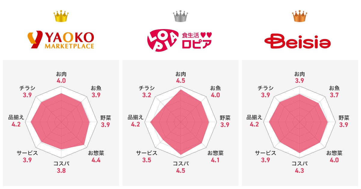 総合賞は、8つの項目の獲得点で決定します。1位に輝いたのは、埼玉県を中心に店舗を展開する「ヤオコー」。品揃えやお惣菜面で特に高い評価を獲得しました。「野菜やお肉、お魚がどれも新鮮で美味しい」「お惣菜にハズレなし!品揃えが豊富で店内がきれい」「ヤオコーPay(独自決済)でポイントが貯まる」などの声が寄せられました。2位には、お肉の質や品揃え、楽しい店作りで高い評価を得た「食生活❤️❤️ロピア(以下ロピア)」がランクインしました。「肉の珍しい部位も置いてあって、行くのが楽しい」「現金オンリーだけど、その分価格に還元している」などの声が上がりました。3位は、手ごろな価格で人気のプライベートブランド商品が豊富な「ベイシア」が選ばれました。「食品だけでなく日用品も安い!店内も広くていい」「楽天ポイント、ベイシアポイントを貯められてお得」など、コスパ面での高い評価を得ています。4位以下にも、多くの方が馴染みのある大手スーパーが並び、プライベートブランドやオリジナル商品を取りそろえているスーパーがランクインしています。