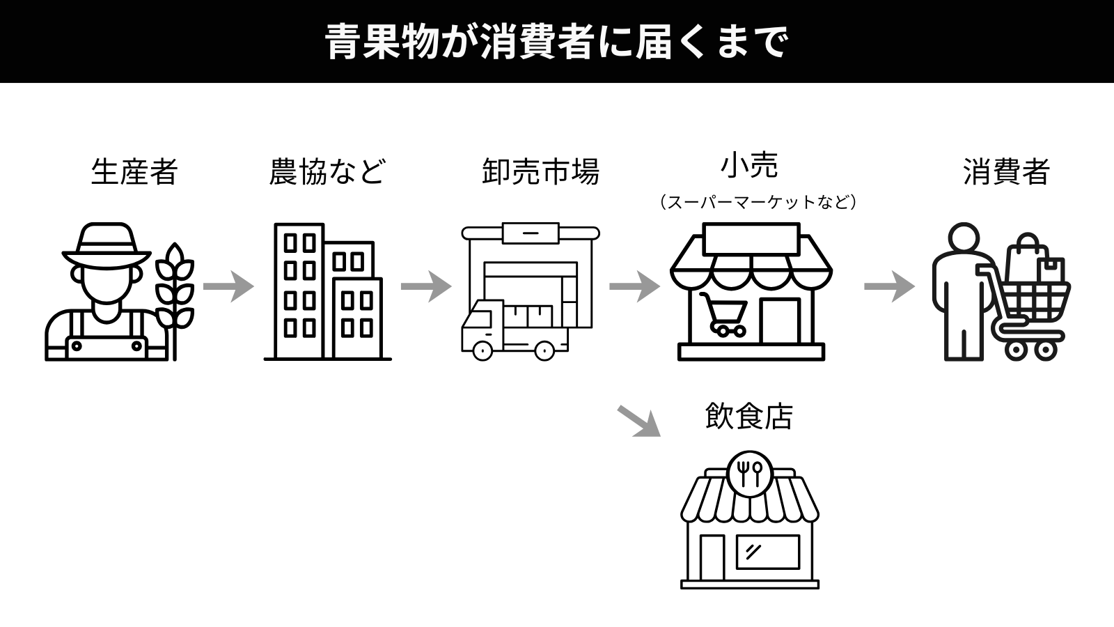 野菜や果物などの農産物は、生産者(農家)から出荷団体(農協など)を経て卸売市場に集荷され、その後、小売業者や外食事業者、加工業者へと販売されます。卸売市場は、全国各地の産地と都市部の消費地をつなぐ結節点として、社会インフラの一端を担っています。